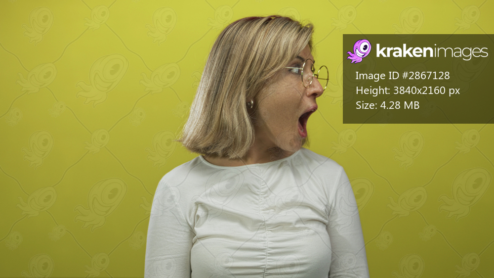 Woman wearing glasses gasps with open mouth and raised hands against yellow backdrop in studio; astonishment.