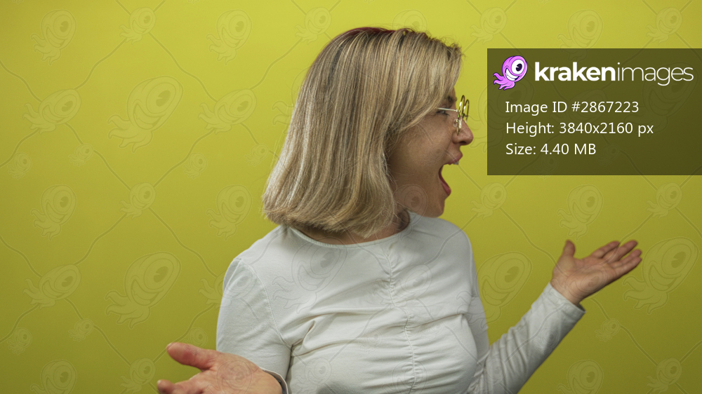Woman wearing glasses gasps with open mouth and raised hands against yellow backdrop in studio; astonishment.