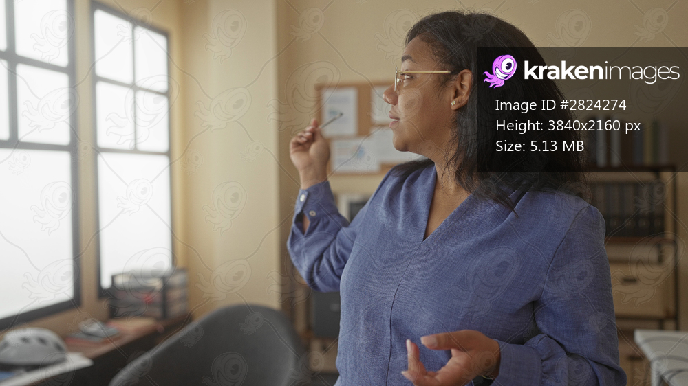 Woman wearing glasses gestures with pen while explaining a strategic plan in office building; confidence.