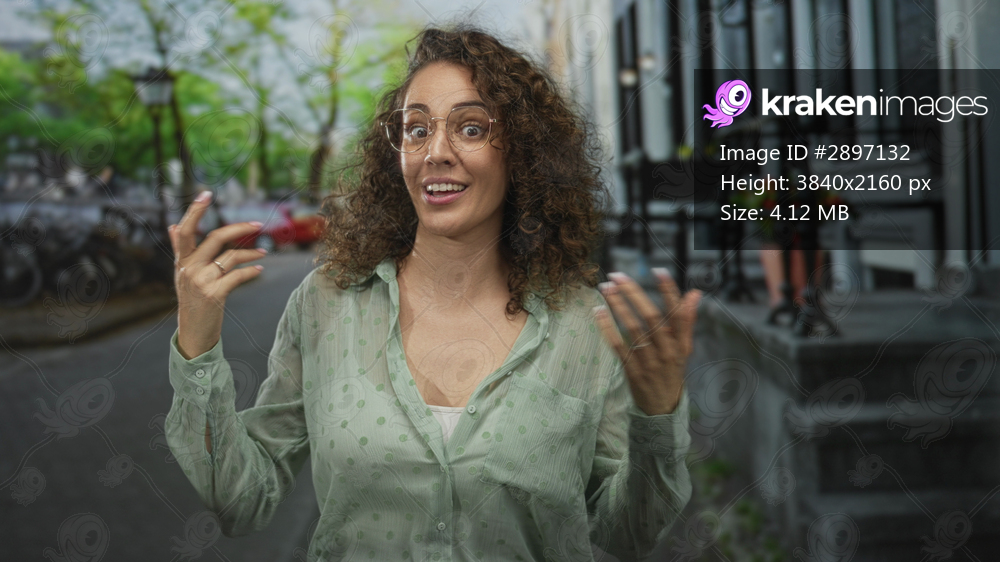 Woman wearing glasses gesturing with hands and smiling on city street while leaning near building steps; joyful expression.