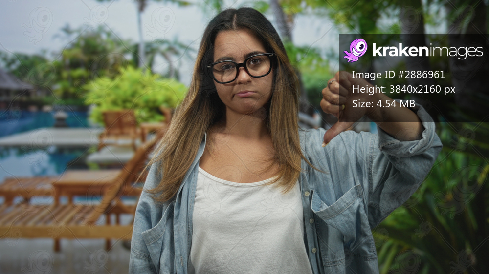 Woman wearing glasses gives thumbs down at resort pool outdoors near lounge chairs, looking unimpressed and dismissive; disappointment rejection.