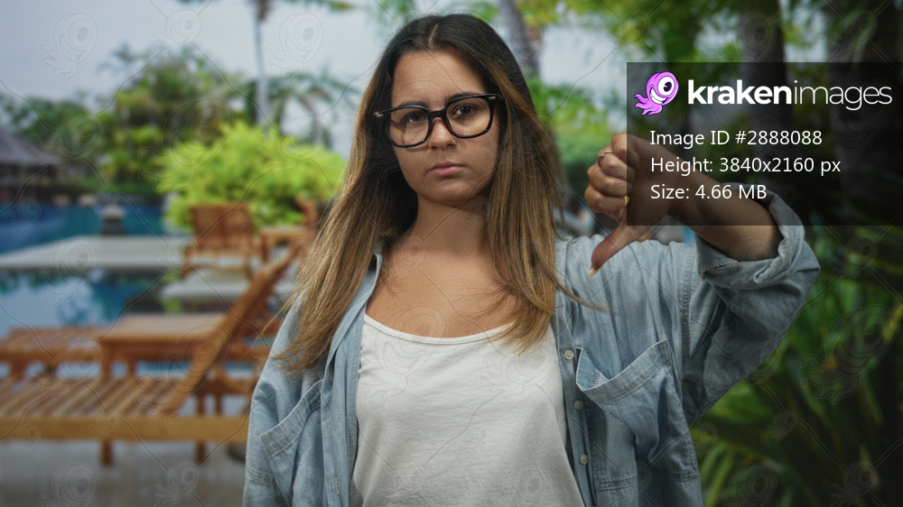Woman wearing glasses gives thumbs down at resort pool outdoors near lounge chairs, looking unimpressed and dismissive; disappointment rejection.