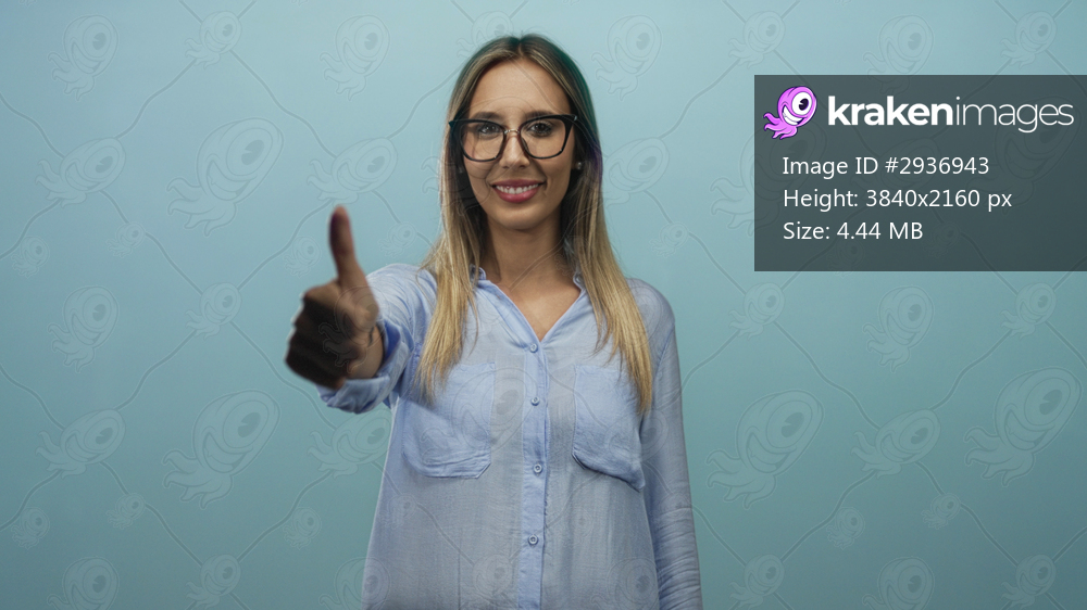 Woman wearing glasses giving thumbs up gesture and smiling in studio against cyan wall; positive confidence.