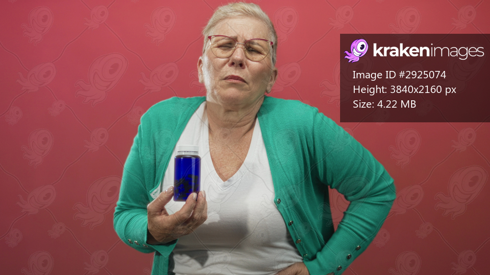 Woman wearing glasses and green cardigan holding blue pill bottle and clutching stomach in pink studio; nausea concern discomfort.