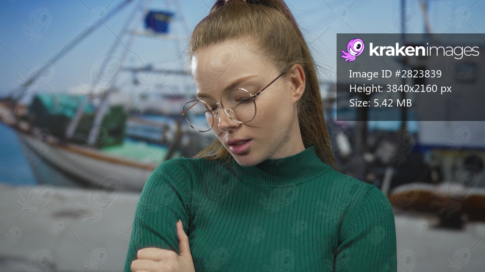 Woman wearing glasses and green sweater holds folded arms in front of docked boats at port on a sunny day; rejection solitude.