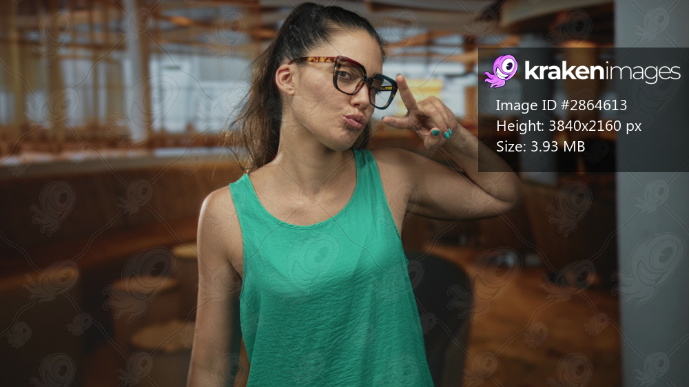 Woman wearing glasses and green tank top making peace sign with fingers in restaurant seating area; playfulness.