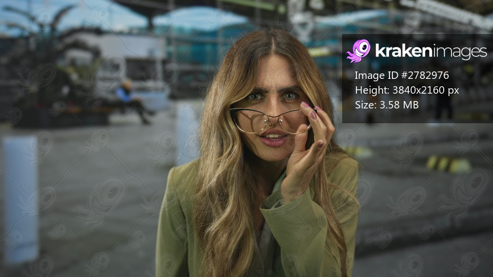 Woman wearing glasses hand covering mouth gesture in busy airport terminal; tiredness fatigue jetlag surprise.