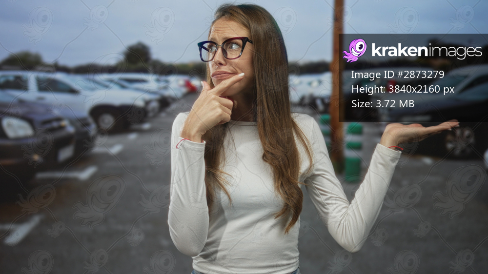 Woman wearing glasses with hand on chin and open palm gesture in street parking lot full of cars and asphalt; doubt.