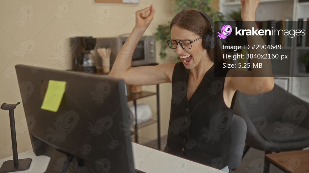 Woman wearing glasses and headphones, smiling and typing at a computer monitor in an office building; remote work concentration productivity.