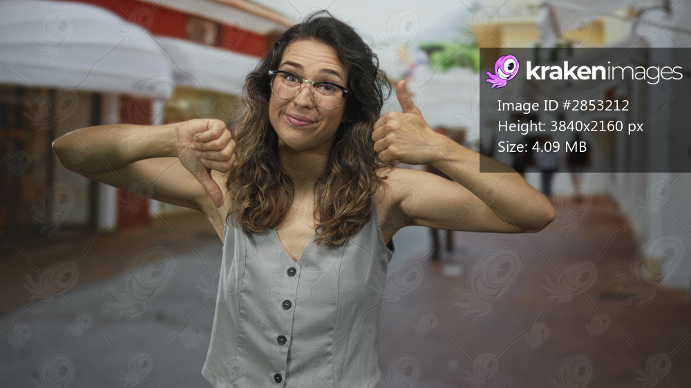Woman wearing glasses with hesitant face shows contrasting thumb up and thumb down gesture on busy urban street; ambivalence.