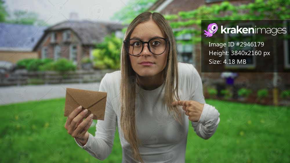 Woman wearing glasses holding a brown envelope and pointing finger to chest in front of a building on a residential lawn; skepticism uncertainty.