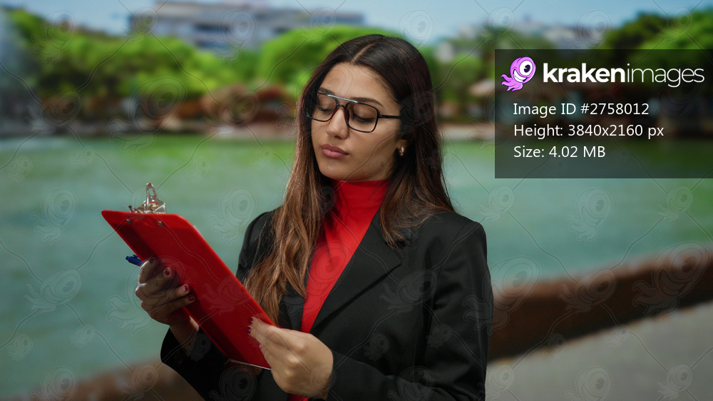 Woman wearing glasses holding a clipboard in a park setting with trees and water in the background capturing an outdoor professional moment.