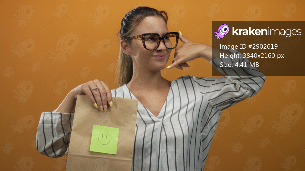 Woman wearing glasses holding a paper bag with a smiley sticky note and points finger in studio; friendly confidence.
