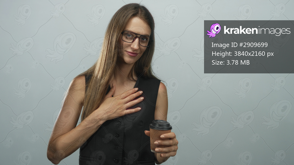 Woman wearing glasses holding a takeaway coffee cup with hand on chest in studio with pale gray blue backdrop; gratitude connection.