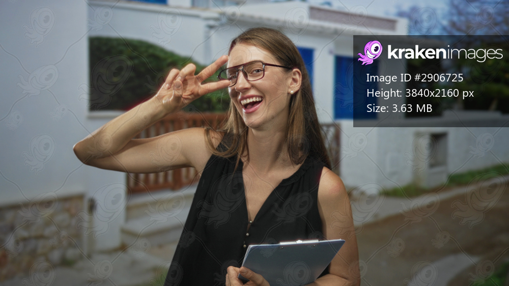 Woman wearing glasses holding blue clipboard smiling and giving peace sign to eye at house entrance on street; playful confidence.