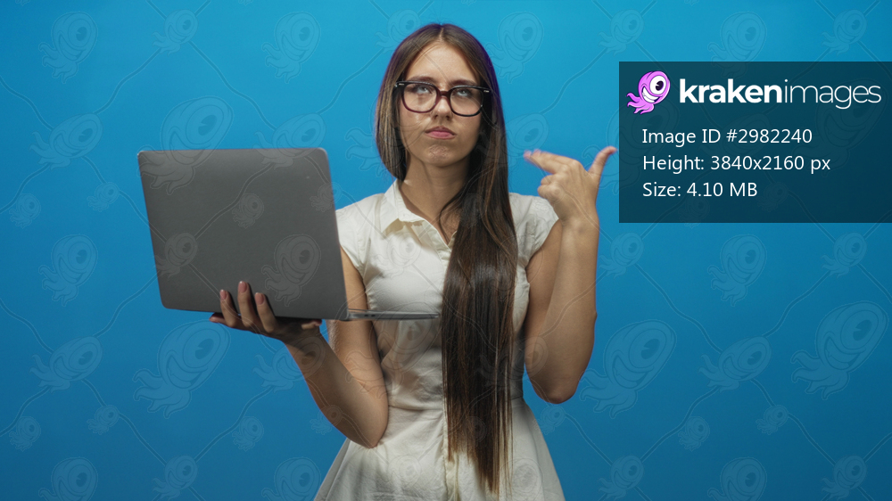 Woman wearing glasses holding laptop and typing with right hand while gesturing with left in studio; digital frustration.