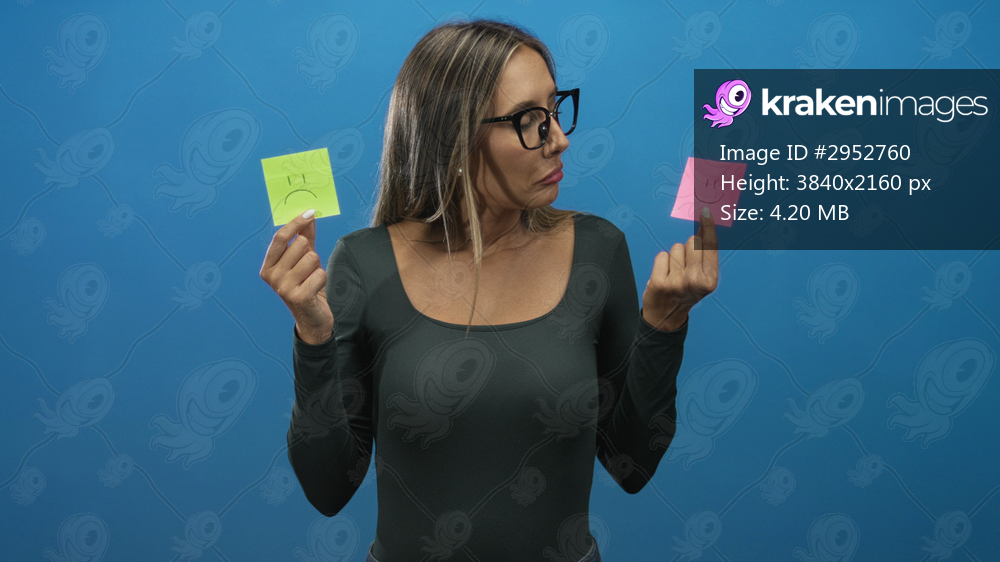 Woman wearing glasses holding pink and green sticky notes showing smile and frown in blue studio; uncertainty decision.