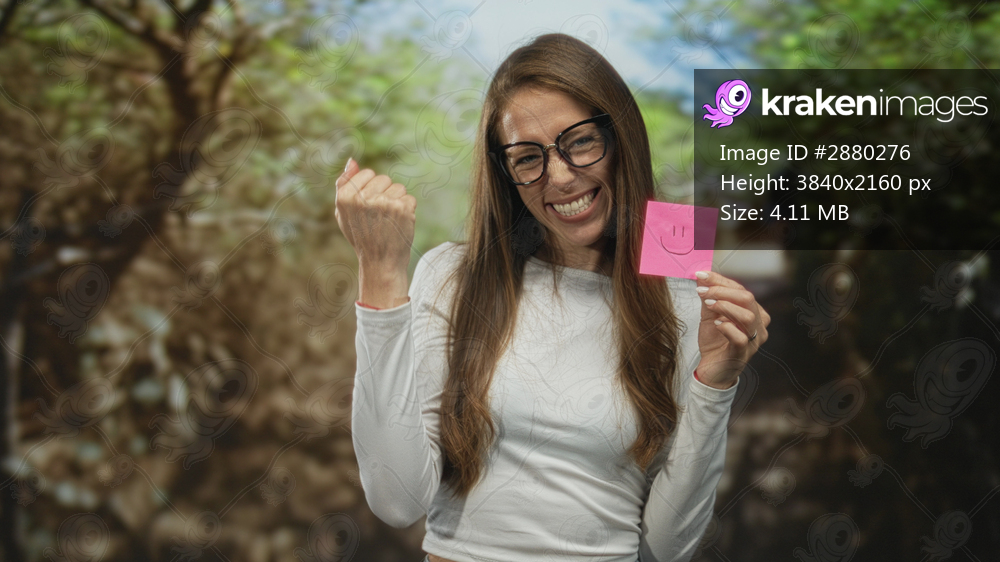 Woman wearing glasses holding pink sticky note with smiley face and fist pump gesture in park among green trees; joy empowerment.