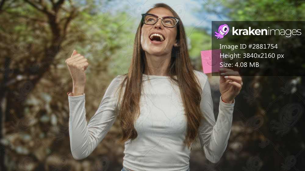 Woman wearing glasses holding pink sticky note with smiley face and fist pump gesture in park among green trees; joy empowerment.