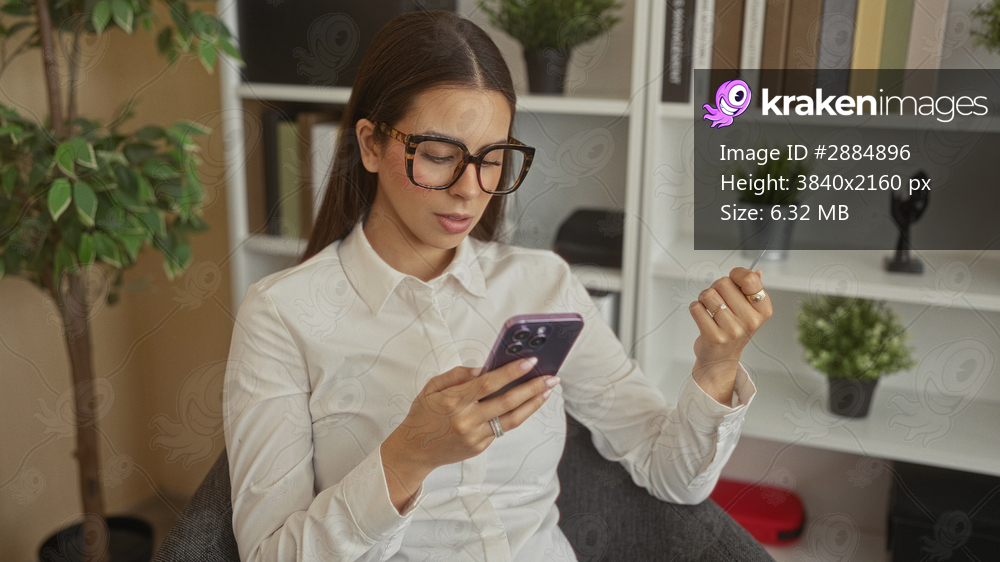 Woman wearing glasses holding smartphone and creditcard while seated and looking at screen in office building; focused online shopping.