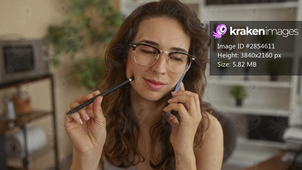 Woman wearing glasses holding stylus near chin while talking on smartphone in building; concentration productivity planning.