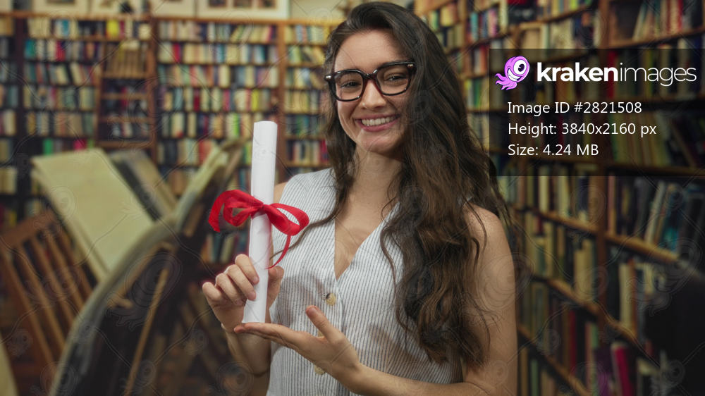 Woman wearing glasses holds a rolled diploma scroll upright near her chest in a library building full of bookshelves and wooden racks; success.