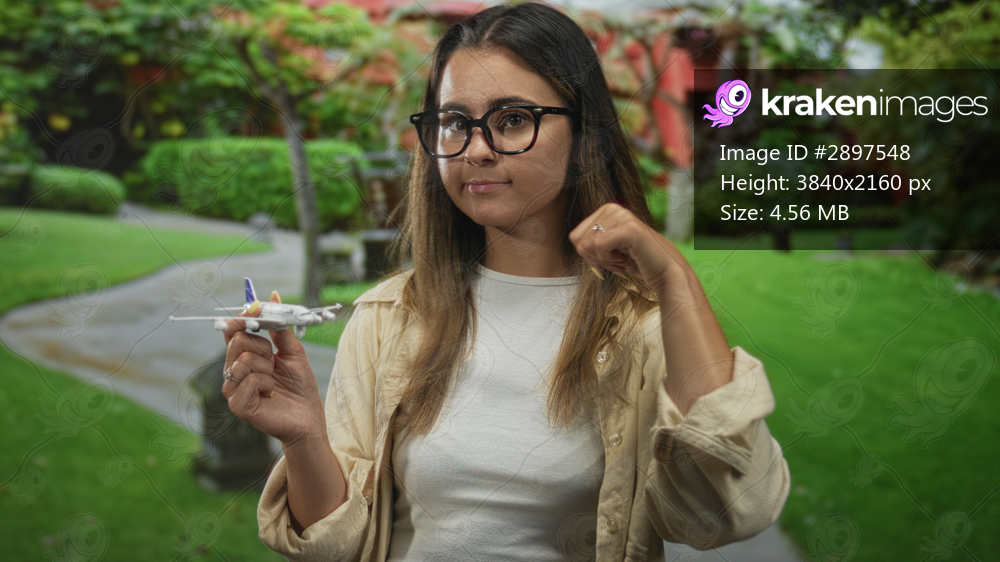 Woman wearing glasses holds a toy airplane and points finger forward in a green park; determination travel inspiration.