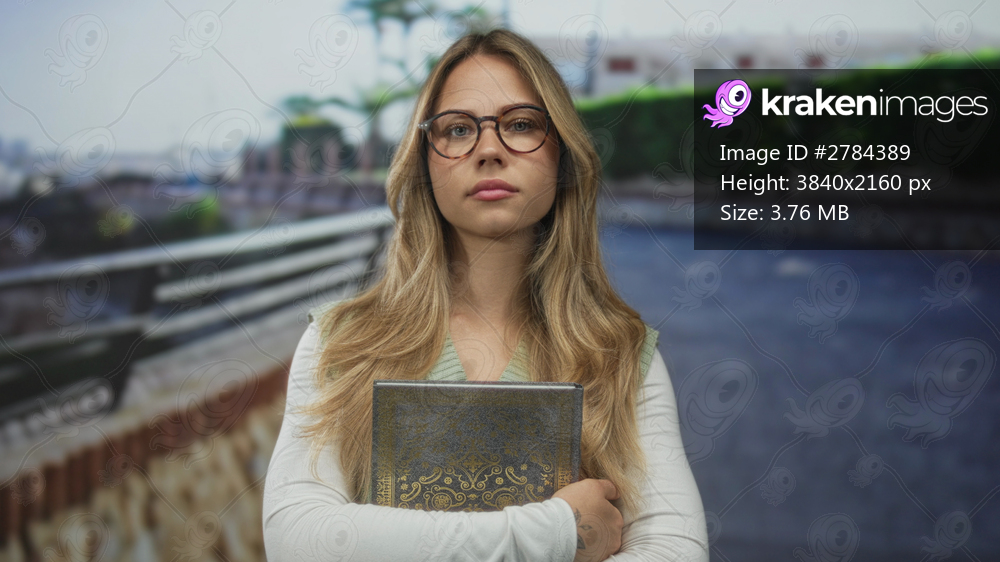 Woman wearing glasses holds book with crossed arms on street; introspection thoughtfulness seriousness.