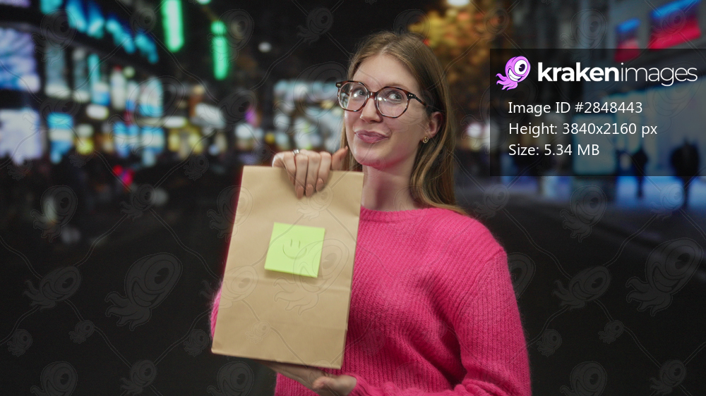 Woman wearing glasses holds brown paper bag and points finger to green sticky note in street; brand promotion happiness.