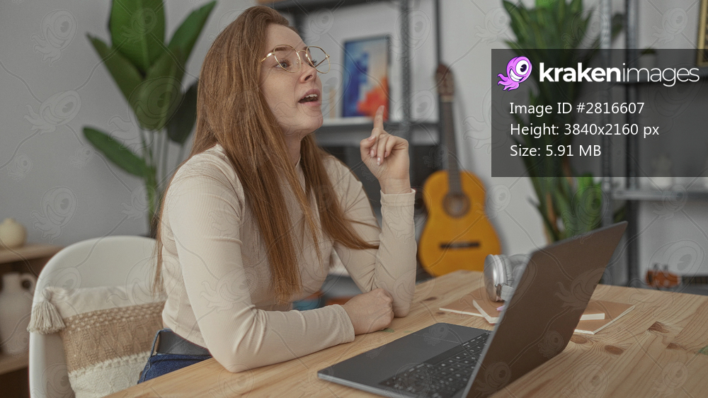 Woman wearing glasses holds hand on cheek over open laptop on wooden desk in modern office; thinking thought pondering doubt.
