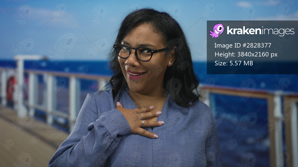 Woman wearing glasses holds hand on chest on cruise deck by ocean horizon with an awkward smile; surprise.