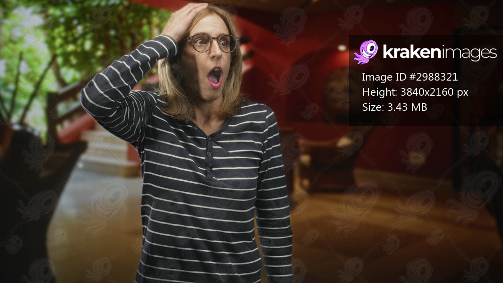 Woman wearing glasses holds hand to forehead with open mouth in a startled gesture inside a building interior with chair, staircase and plant visible; surprise. - Kraken Images