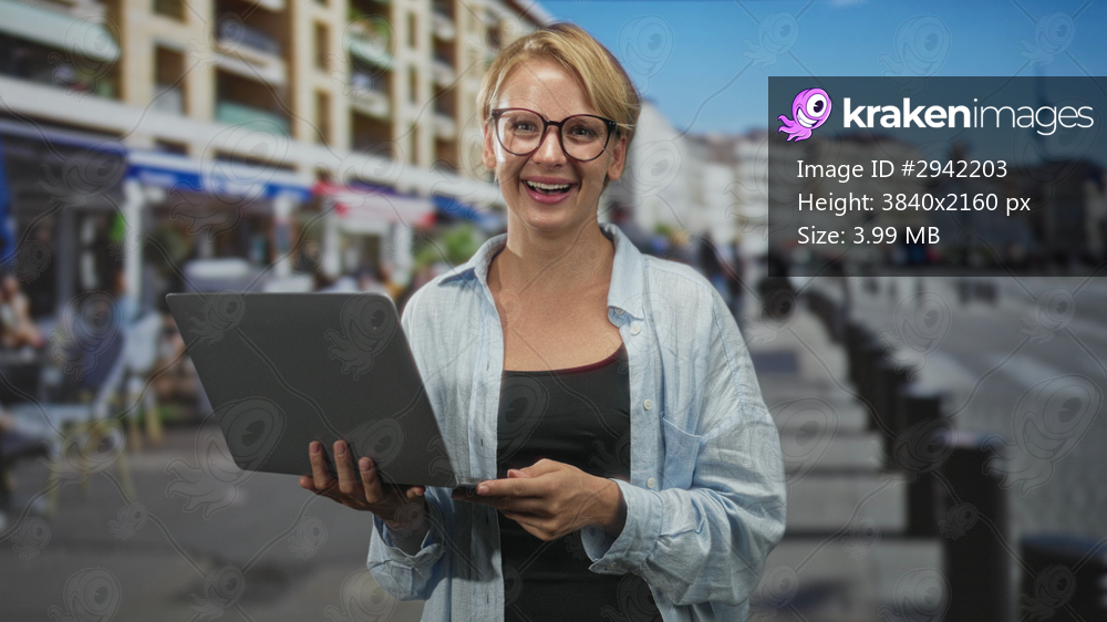 Woman wearing glasses holds laptop with both hands and smiles while typing on a street with cafes and bollards; remote work happy.
