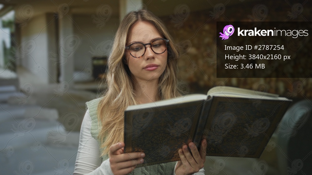 Woman wearing glasses holds ornate book while reading in softly lit spa room; serenity focus calm concentration.