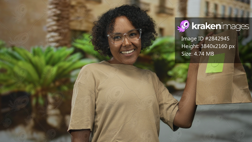 Woman wearing glasses holds paper bag with smiley note on city street; happiness generosity kindness.