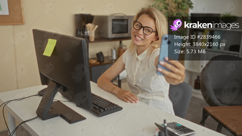 Woman wearing glasses holds smartphone at building desk, smiling at computer screen during video call; happiness.