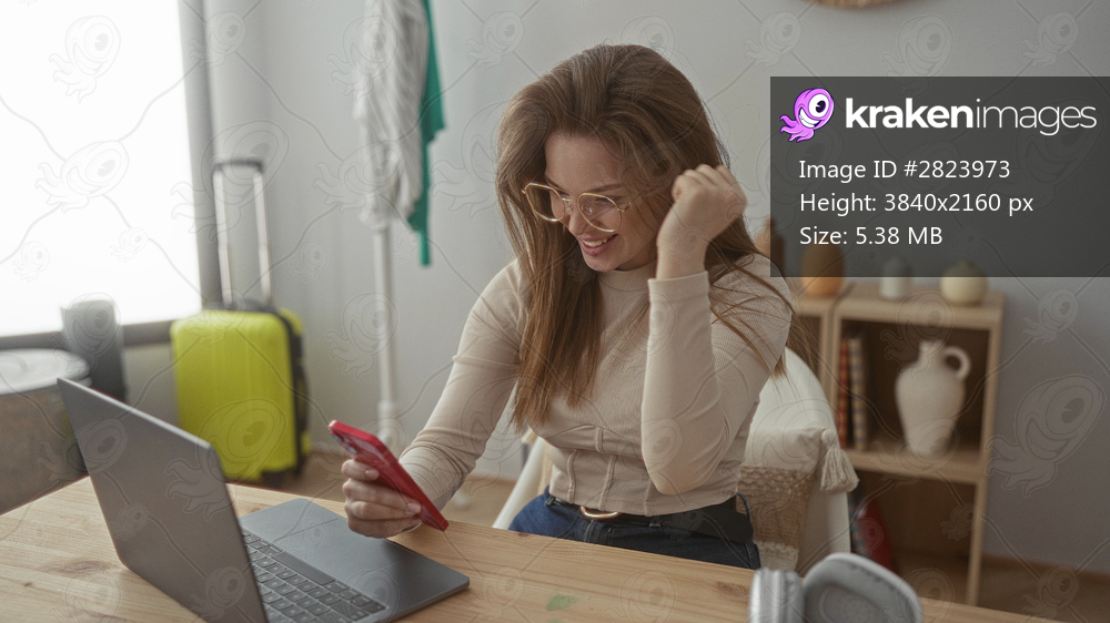 Woman wearing glasses holds smartphone and pumps fist at wooden desk with open laptop in office; triumph.