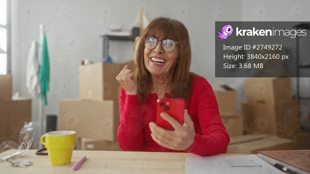 Woman wearing glasses holds smartphone smiling inside new apartment surrounded by moving boxes, cup, pen, keys scattered, green jacket hung, unpacking scene implies fresh start