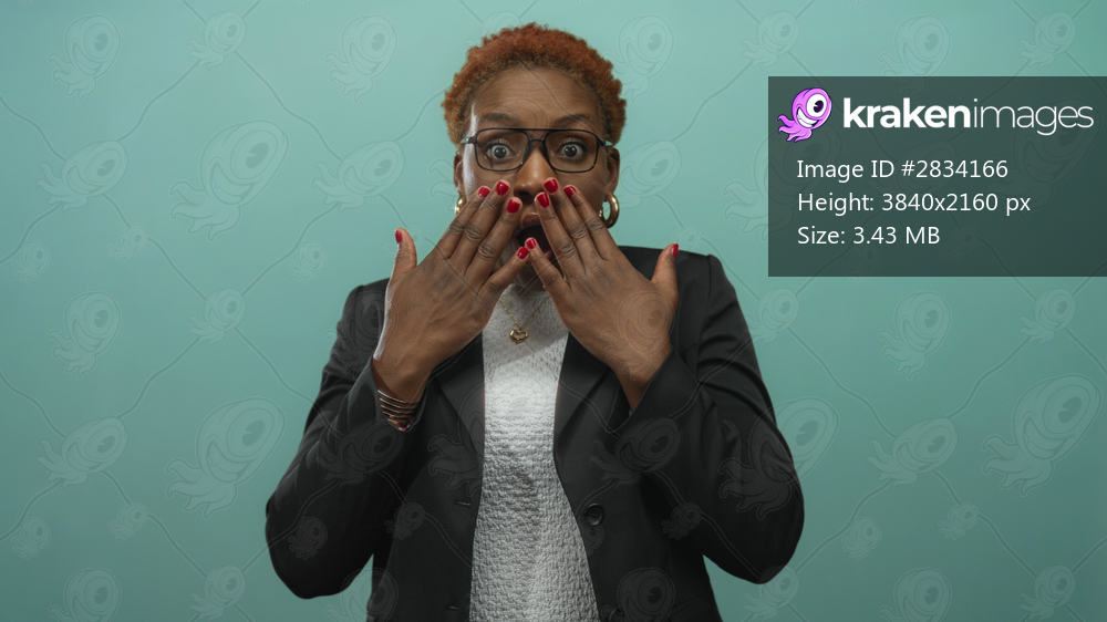 Woman wearing glasses and hoop earrings covers mouth with hands against teal studio background; surprise shock astonishment awe.
