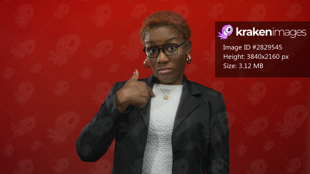 Woman wearing glasses and hoop earrings in black blazer and white top points thumb to chest in red studio; doubt.