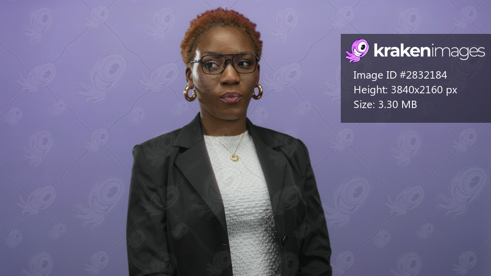 Woman wearing glasses and hoop earrings in black blazer and white top smiles in studio portrait; confidence.
