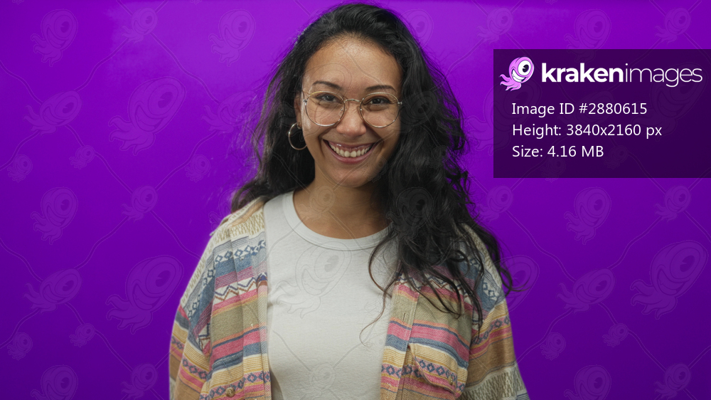 Woman wearing glasses and hoop earrings smiles broadly with arms raised in purple studio; joy confidence warmth connection.