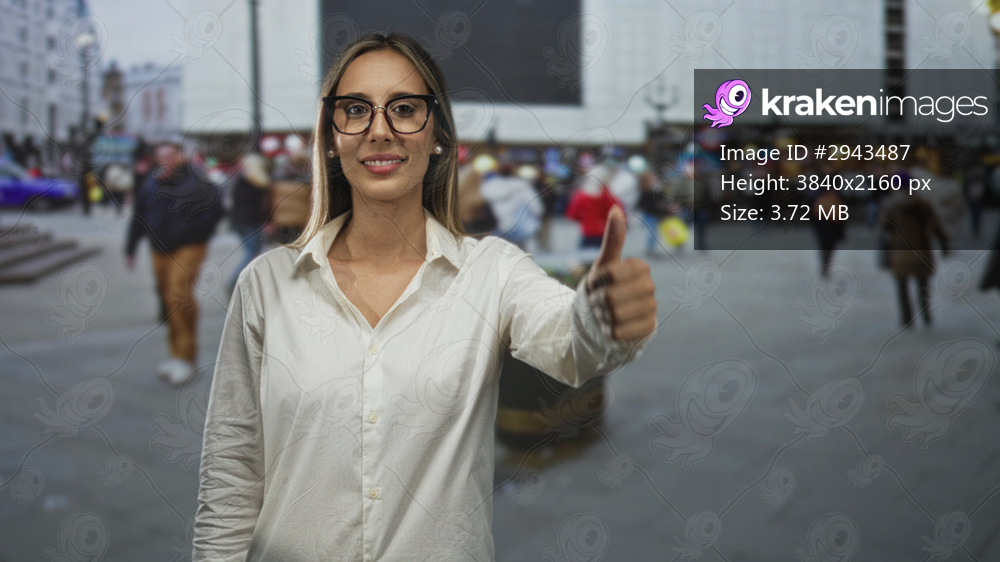 Woman wearing glasses in a white button shirt standing with one arm slightly extended toward the camera on a busy city street near shops and blurred pedestrians; quiet confidence. - Kraken Images