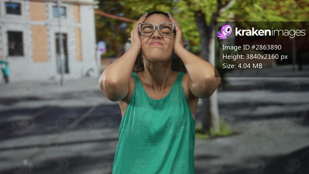Woman wearing glasses in green top yawns with hand covering mouth on sunny urban street lined with trees and buildings; fatigue.