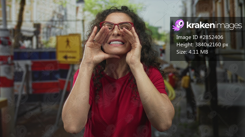Woman wearing glasses in red shirt shouts with hands cupped around mouth at building site outdoors; confidence.
