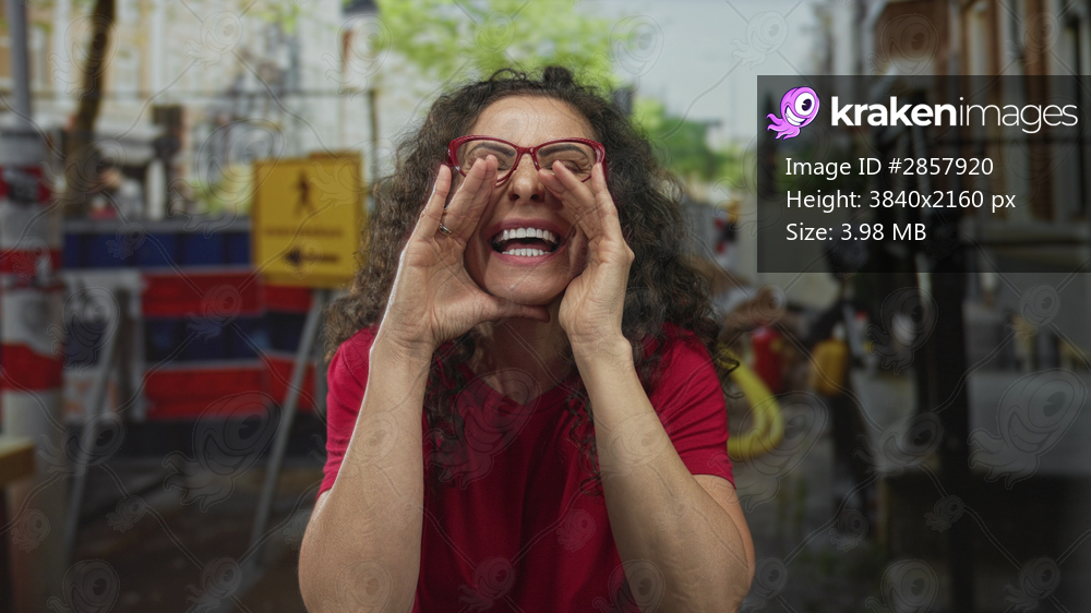 Woman wearing glasses in red shirt shouts with hands cupped around mouth at building site outdoors; confidence.