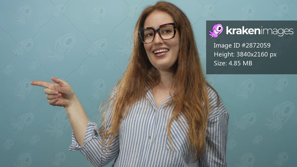 Woman wearing glasses in striped shirt points finger to the side and makes call hand gesture in blue studio; friendly.