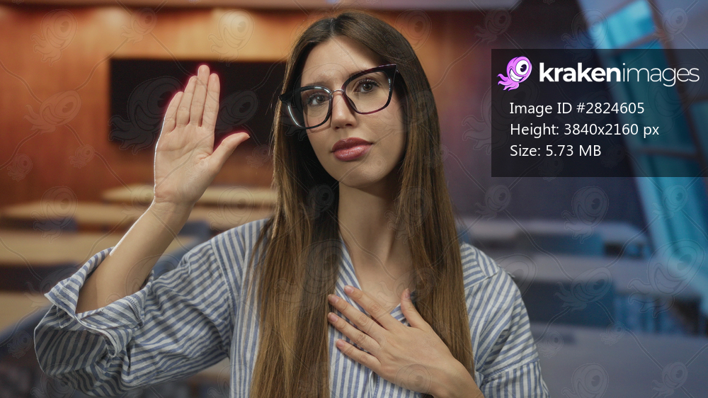 Woman wearing glasses in striped shirt raises hand and touches chest in classroom; commitment sincerity.