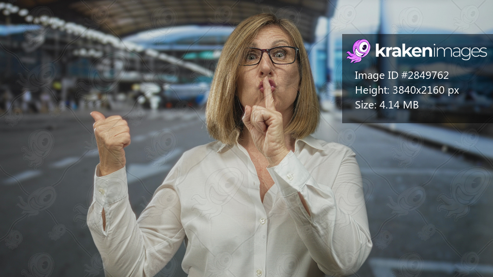 Woman wearing glasses in white shirt with finger to lips for silence and raised thumb behind at airport terminal; quiet.
