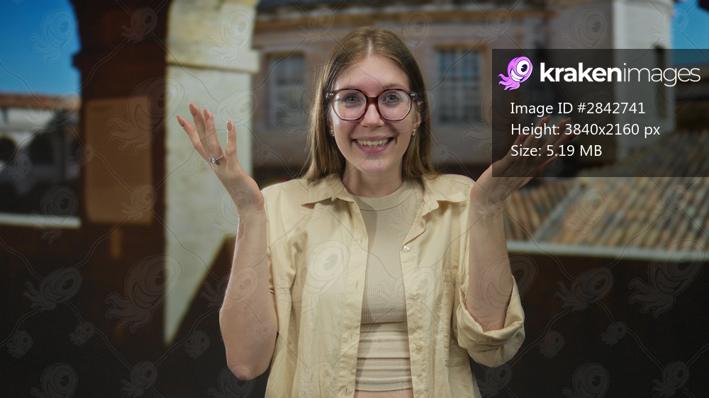 Woman wearing glasses lifting hands by face in front of sunlit weathered stone building facade in old town; surprise.
